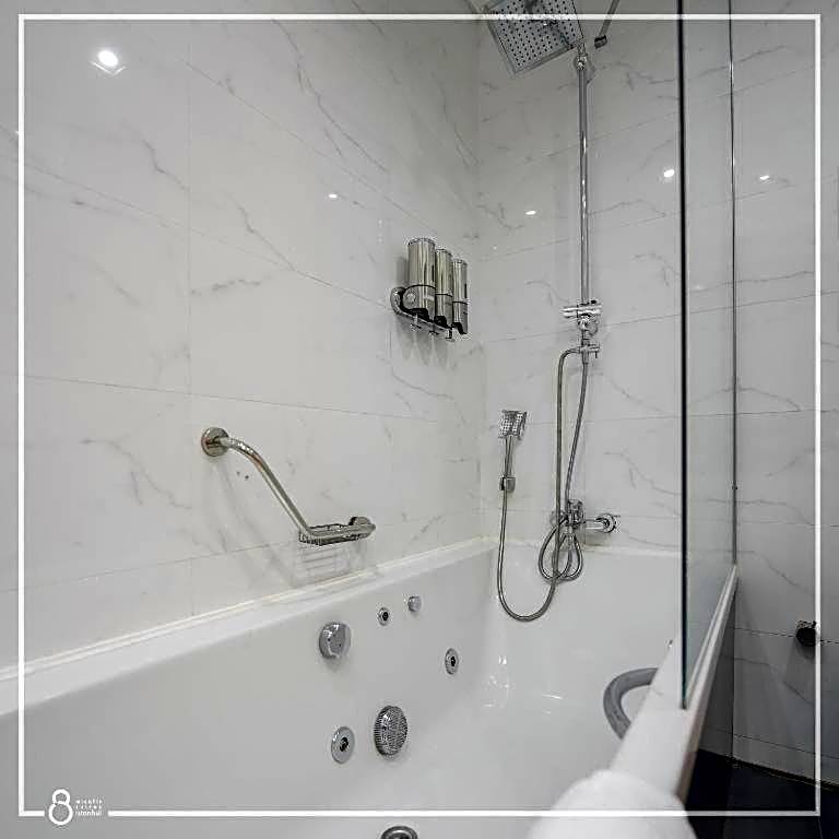 This spacious suite features wooden floors. It also features a marble bathroom with a king-size bath tub and free toiletries. It also has free coffee&tea setup and 0.75 lt water upon check-in.